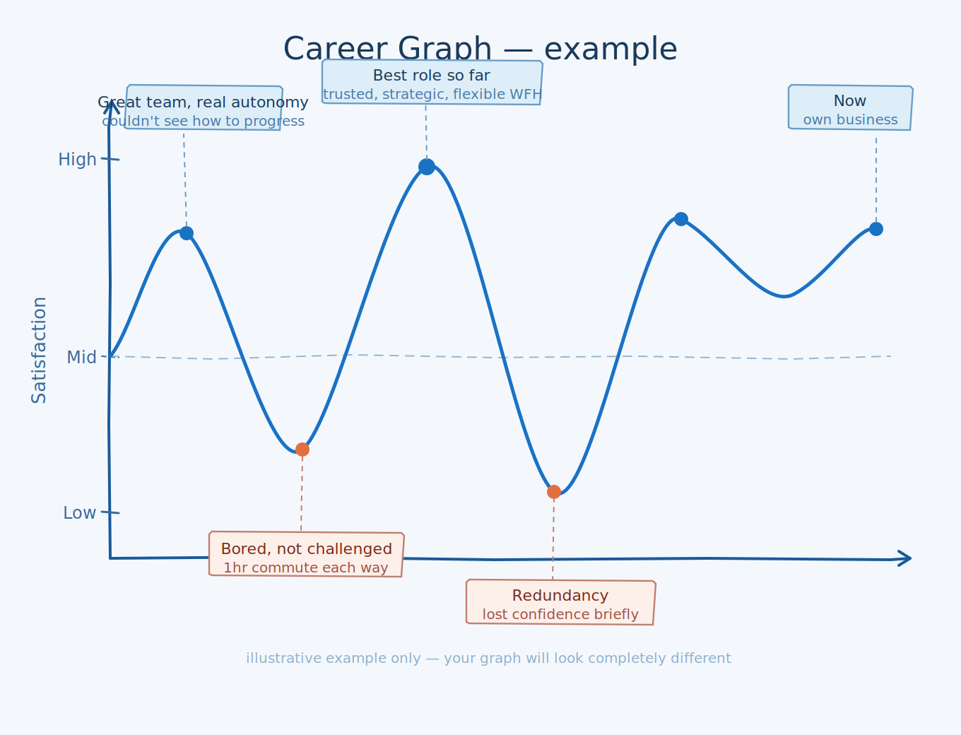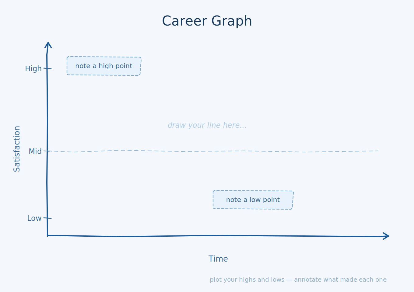 What if my career graph is mostly low? That's important information. It's worth exploring whether the lows reflect the specific roles you've been in, the conditions you've been working under, or something broader. A persistently low graph isn't a verdict on you, it's usually a signal that something in the fit hasn't been right.